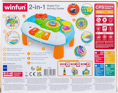 2-IN-1 DESIGN: Transforms from a stand-up activity table to a floor play center with detachable legs, offering flexibility to grow with your child. Includes engaging activities like a rattle spinner crab, sliding sea star, turning click-clack fish, flip-up shell with a baby-safe mirror, push-down squeaker, and light-up piano keyboard.