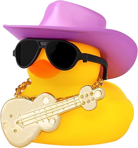 Package Content: Comes with 1pc rubber duck with a mini cowboy hat, sunglasses, necklace, mini guitar decoration, and double-sided tapes.