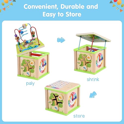 8 in 1 Wooden Activity Cube:Our wooden activity cube offers 8 different ways to play, including a bead maze, rotating gears, a learning clock, a puzzle maze, an abacus, carrot harvest, and word cards with a flip top. With so many options, children will stay engaged and excited to play with this toy