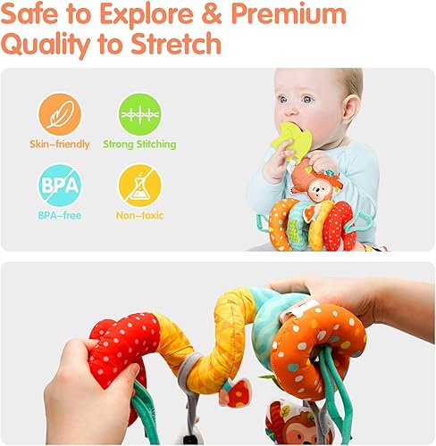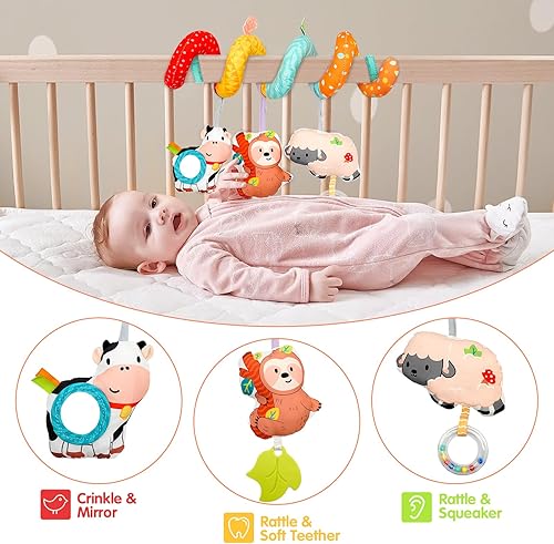 [BRAIN DEVELOPMENTAL SENSORY TOYS FOR 0-12 MONTHS] The spiral carseat toys can be rearranged and detached individually. You can easily hang them on the car seat, baby carrier, stroller bar, crib, bassinet, or play gym. Each hanging part offers a unique sound, and it can encourage exploration and improve motor skills. With the stroller toys for babies 0-6 months, parents can teach babies to recognize the colorful animals, tell stories to increase their curiosity and enrich cognitive worl