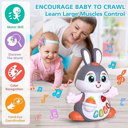 【Encourage Baby to Crawl & Build Muscle】When pressing the button on the head of the dancing bunny, it will dance and move with happy baby tunes music & lights. It will attract your baby to chase and crawl. Ideal for babies to develop gross motor skills and learn how to control large muscles for walking, running, jumping, and body balance during play.Great baby musical and light-up crawling toys, Perfect choice as Christmas gifts for 9-12 month old