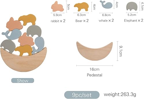 SILICONE STACKING TOYS: The set contains 8 cute animal models (2.4 * 1.6 inches each), including two rabbits, two bears, two whales and two elephants, and a wooden moon (6.3 * 3.6 inches)